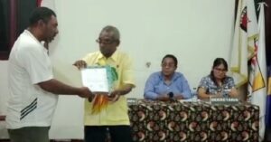 Sekretaris DPC Partai Gerindra Boven Digoel, Viktor Kuktem menyerahkan berkas calon anggota DPRD dan diterima Silvester Wogan, Anggota KPUD Boven Digoel, pada 20 Agustus 2023. Calon yang didaftar semuanya orang asli Boven Digoel. Foto: DPC Partai Gerindra Boven Digoel.