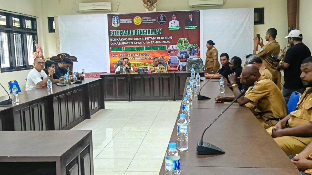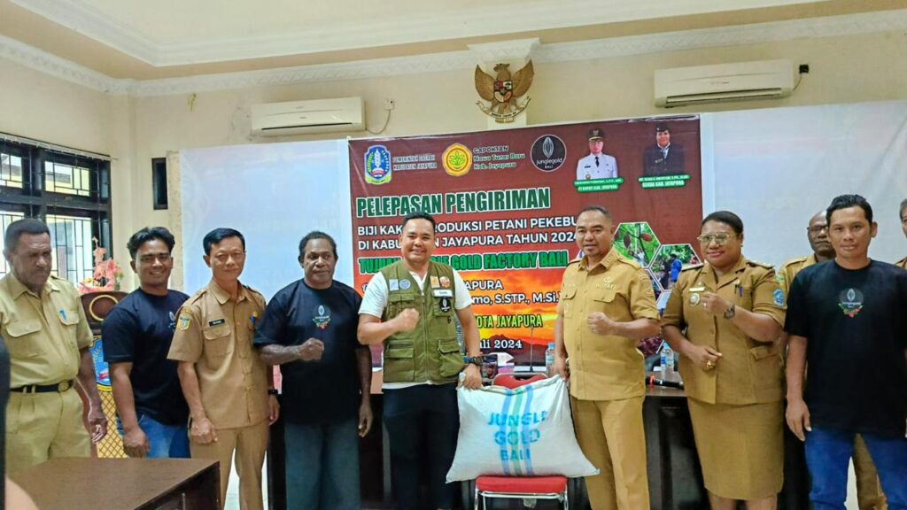 SENTANI, SuaraPerempuanPapua – Pengiriman Biji Kakao premium sebanyak 4 ton produksi petani pekebun Kabupaten Jayapura tujuan Jungle Gold Factory Bali di lepas oleh Penjabat (Pj) Bupati Jayapura, Triwarno Purnomo, S.STP., M.Si.