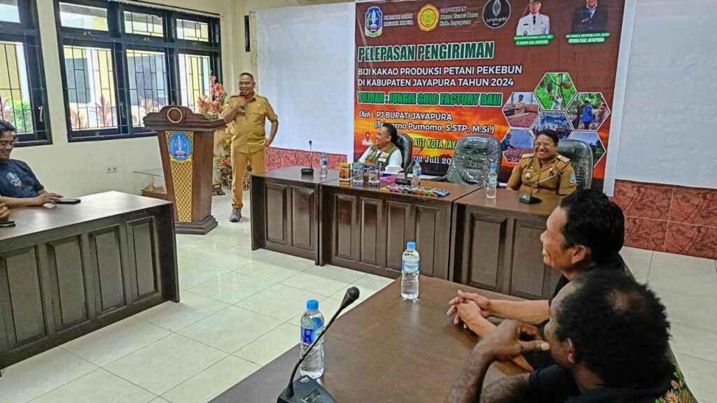 Pelepasan 4 ton biji kakao super oleh Pj Bupati Triwarno kepada Owner PT. Bali coklat, Ida Bagus Namarupa didampingi Plt Kepala Dinas Perkebunan dan Peternakan Kabupaten Jayapura, Jenny Susan Deda dan para petani pekebun kakao di aula lantai I Kantor Bupati Jayapura, Selasa, 02/07/2024.