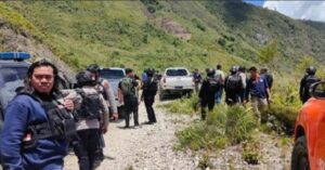 Pasukan gabungan Polri, TNI dan Satgas Cartenz Damai 2023 melakukan olah tempat kejadian perkara sebelum mengevakuasi jenazah korban pembunuhan, Michelle Kurisi Doga dari Lanny Jaya menuju RSUD Wamena, pada Kamis, 31 Agustus 2023. Foto: Marco Kerda.